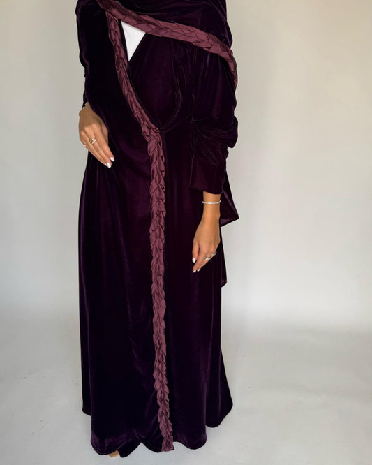 A473 - Purple Braided Velvet Abaya with Matching Velvet Head Scarf