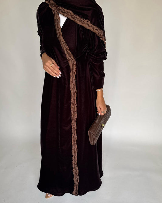A477 - Brown Braided Velvet Abaya with Matching Velvet Head Scarf