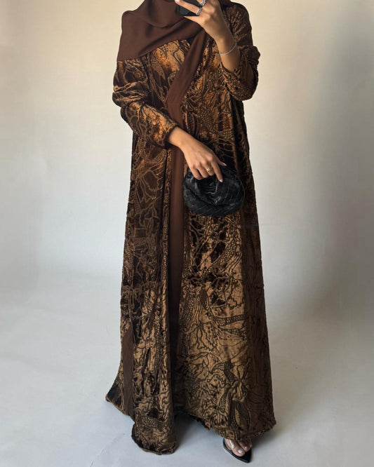 A479 - Brown Pattern Velvet Abaya