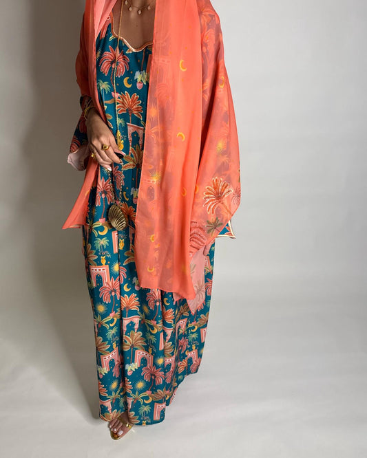 A519 - Orange & Pink Moon & Palm Tree Pattern Jalabiya and Head Scarf