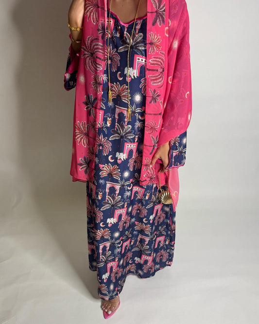 A520 - Navy Blue & Pink Moon & Palm Tree Pattern Jalabiya and Head Scarf