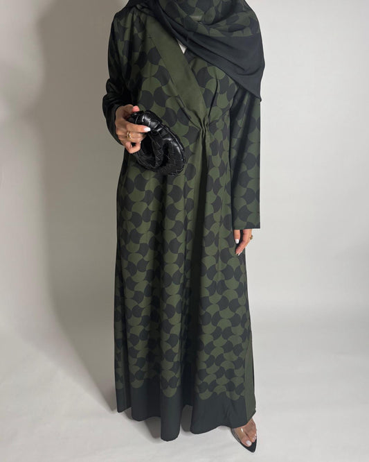 A280 - Shades of Olive Green Half Bisht Pattern Abaya & Matching Head Scarf
