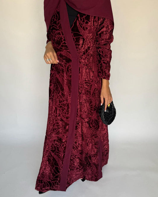 A481 - Maroon Pattern Velvet Abaya