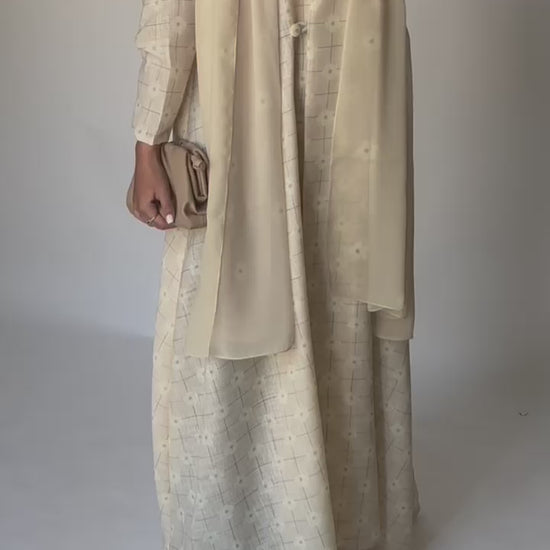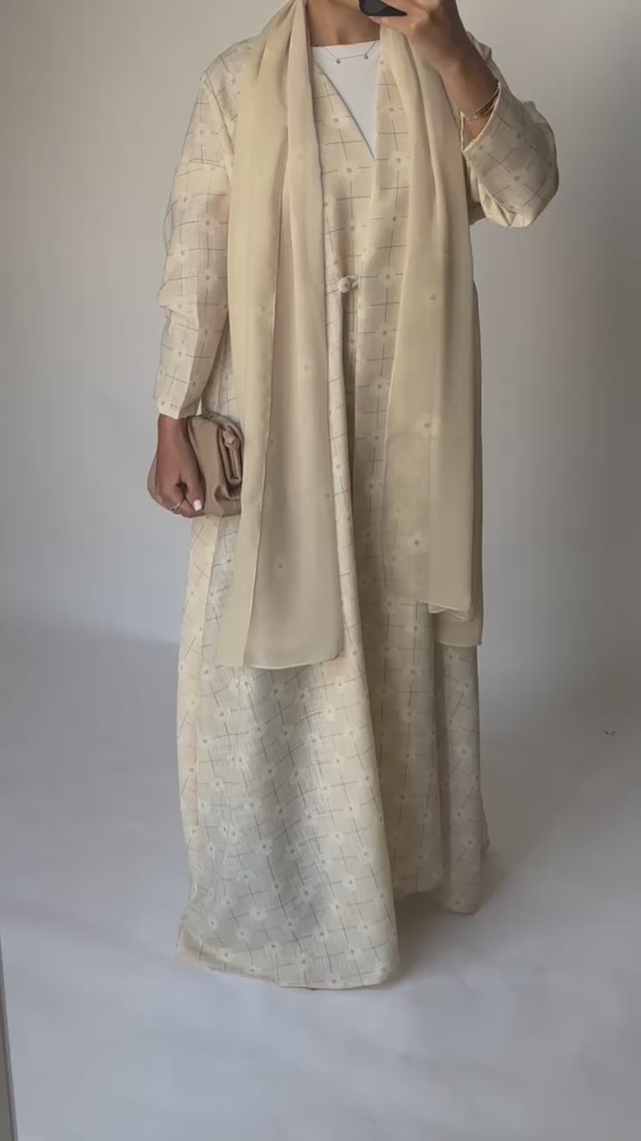 Butter Yellow Flower Light Weight Linen A-Cut Summery Abaya with Fitted Sleeves & One Button. Comes with a Matching Head Scarf. Perfect for the Summer!