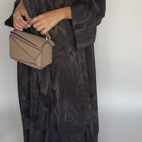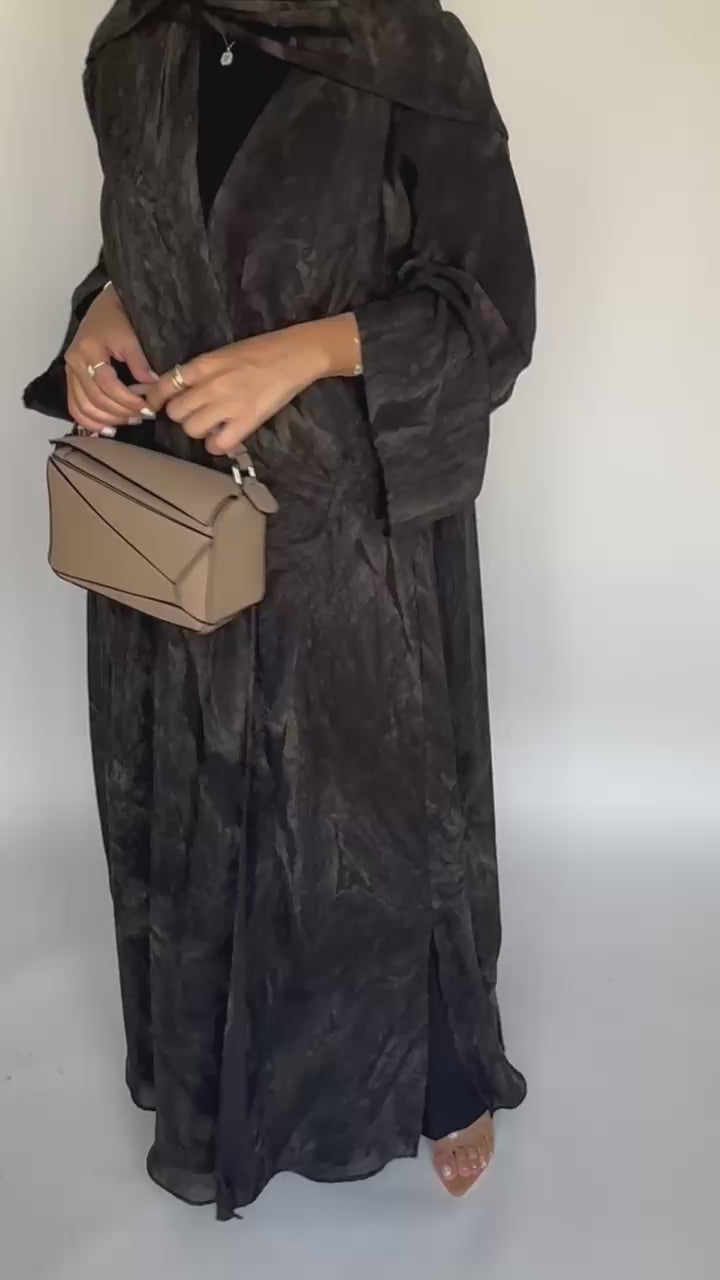 Black with a hint of Brown Pattern Chiffon A-Cut Abaya with Matching Head Scarf.