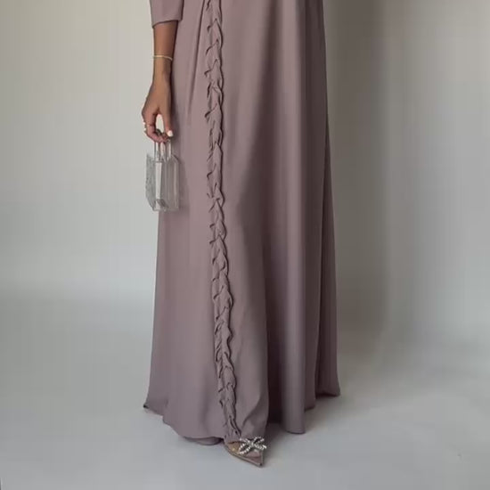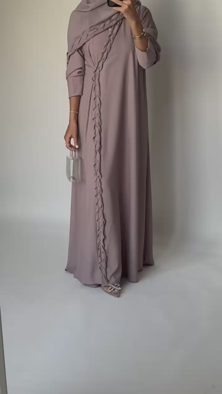 Taupe Braided Crepe A-Cut Abaya with Matching Head Scarf. Braids added to one corner of the Head Scarf. The abaya is very comfortable and elegant for everyday use.