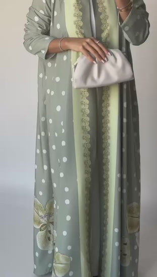 Green Polka Dot Flower Crepe A-Cut Abaya with Matching Head Scarf.