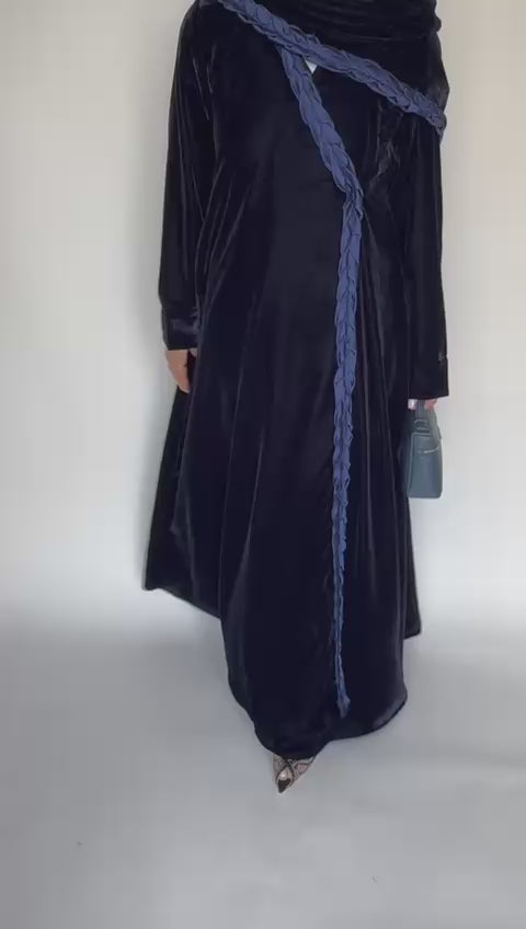 A474 - Navy Blue Braided Velvet Abaya with Matching Velvet Head Scarf