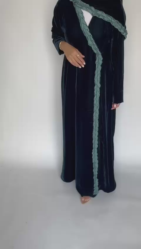 A476 - Turquoise Braided Velvet Abaya with Matching Velvet Head Scarf