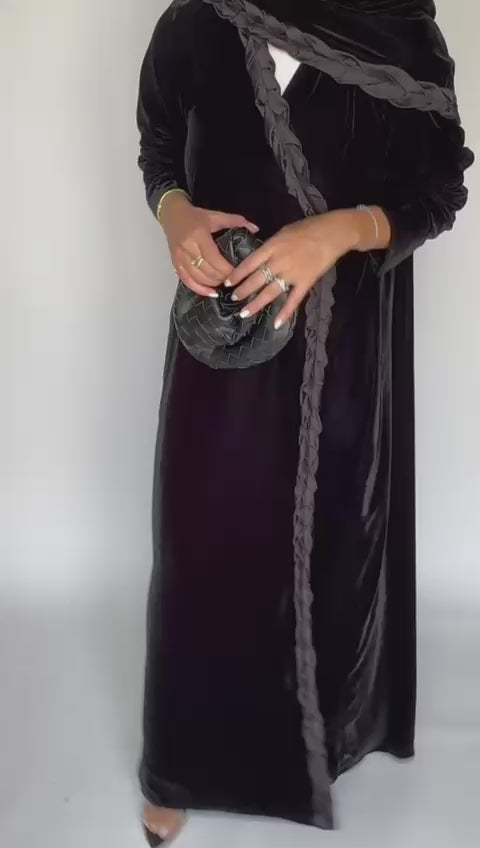 A478 - Black Braided Velvet Abaya with Matching Velvet Head Scarf