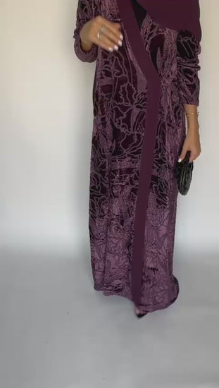 Purple Winter Velvet A-Cut Abaya with Matching Head Scarf. One button added to the corner of the abaya. The abaya is very comfortable and elegant for everyday use.