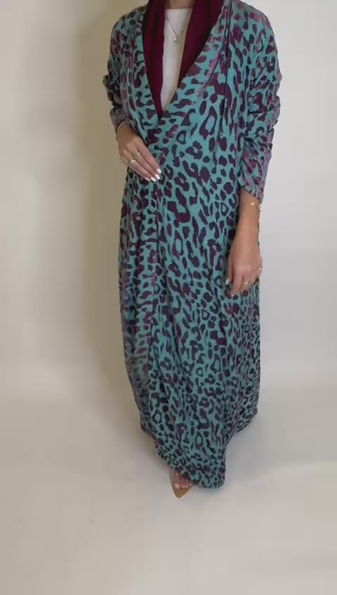 Blue & Purple Winter Velvet Leopard Pattern A-Cut Wide Wrap Abaya with Matching Head Scarf. The abaya is very comfortable and elegant for everyday use.