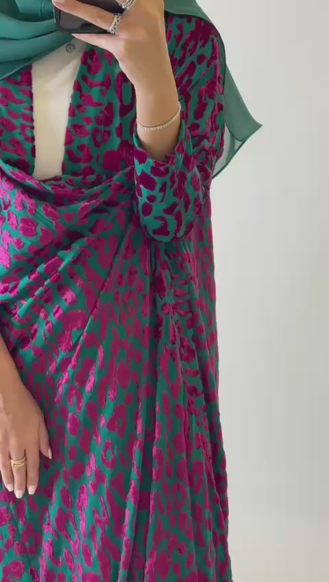 A486 - Green & Pink Leopard Pattern Velvet Abaya