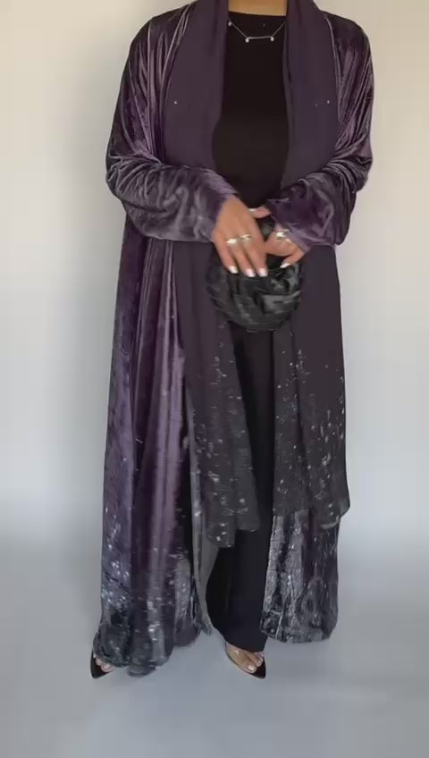 Galaxy Purple to Black Velvet A-Cut Wide Wrap Abaya & Matching Head Scarf.