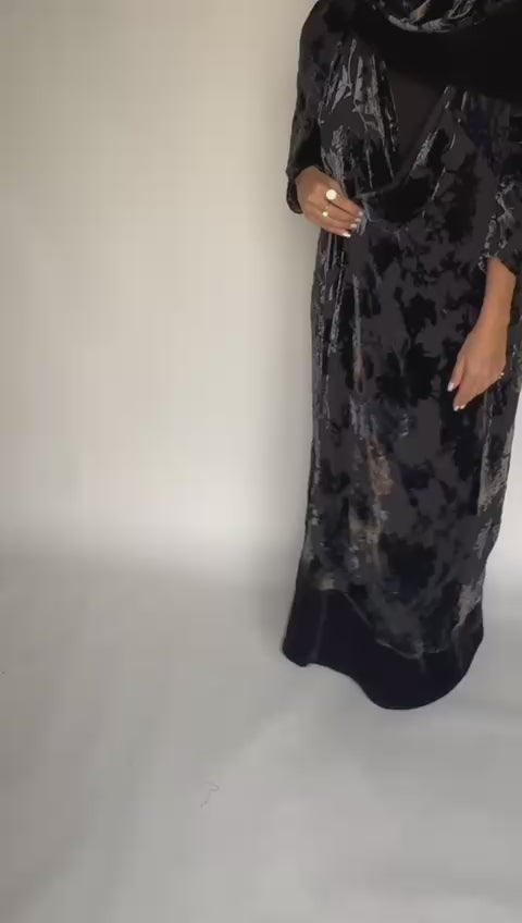 Black/ Blue Velvet & Chiffon Pattern A-Cut Wide Wrap Abaya with Matching Head Scarf