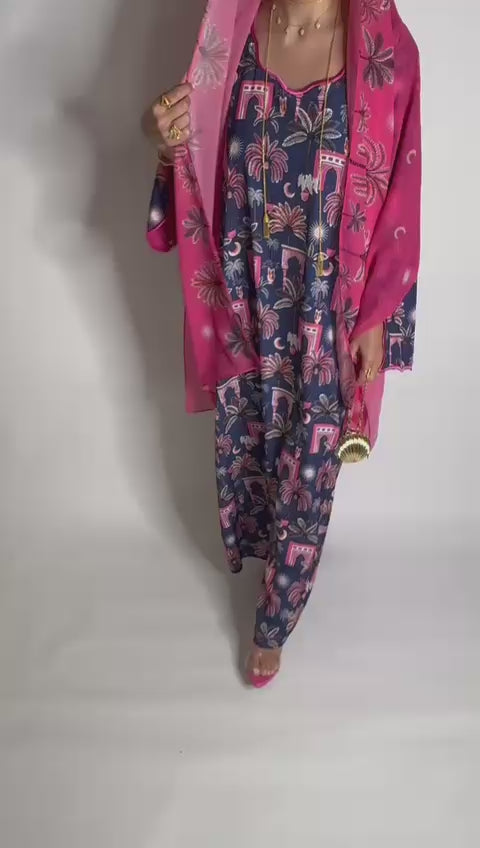 Navy Blue & Pink Moon & Palm Tree Pattern Jalabiya with Matching Pink Head Scarf