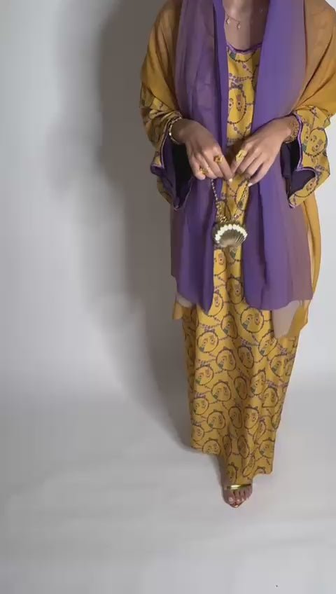 Mustard & Purple Henna Pattern Jalabiya with Embroidered Sleeves & Matching Ombre Head Scarf