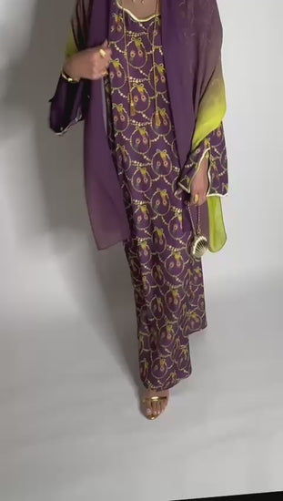 A532 - Dark Purple & Yellow Henna Pattern Jalabiya & Matching Ombre Head Scarf