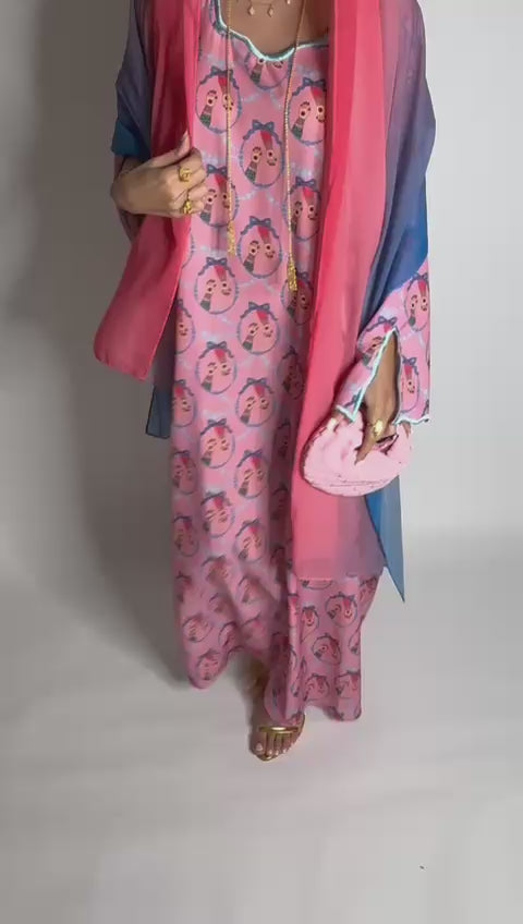 Pink & Blue Henna Pattern Jalabiya with Embroidered Sleeves & Matching Ombre Head Scarf