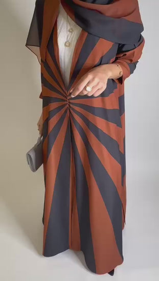 Burnt Orange & Dark Gray Zebra Pattern A-Cut Abaya & Matching Head Scarf. One button added to the middle of the abaya. The abaya is very comfortable and elegant for everyday use.