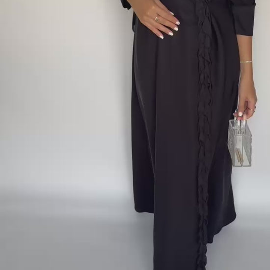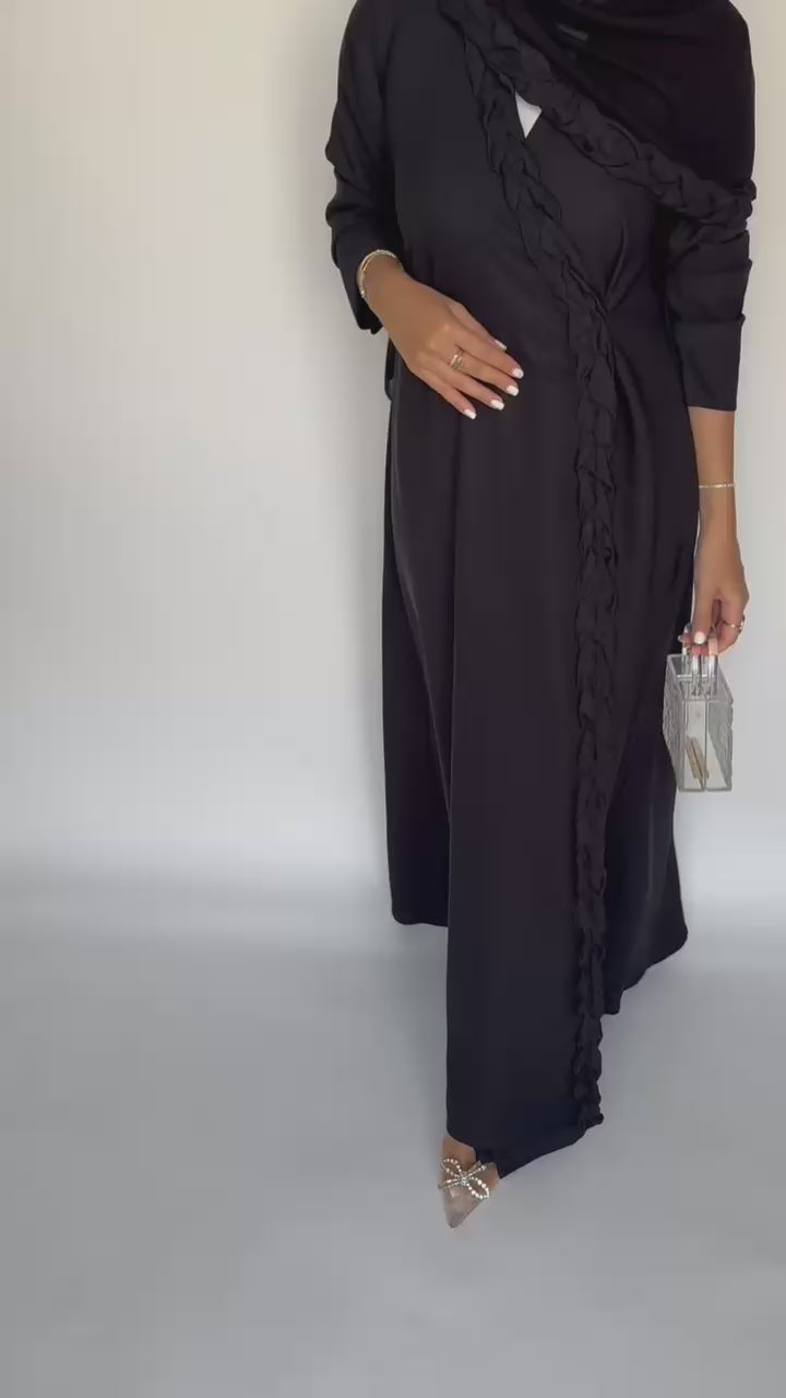 Black Braided Crepe A-Cut Abaya with Matching Head Scarf. Braids added to one corner of the Head Scarf. The abaya is very comfortable and elegant for everyday use.