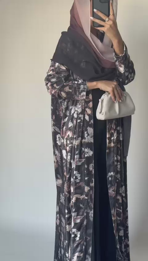 Gray with Hint of Pink Velvet A-Cut Wide Wrap Abaya with Matching Ombre Head Scarf.