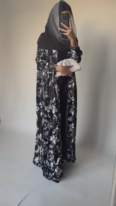 Black & Gray Velvet A-Cut Wide Wrap Abaya with Matching Ombre Head Scarf.