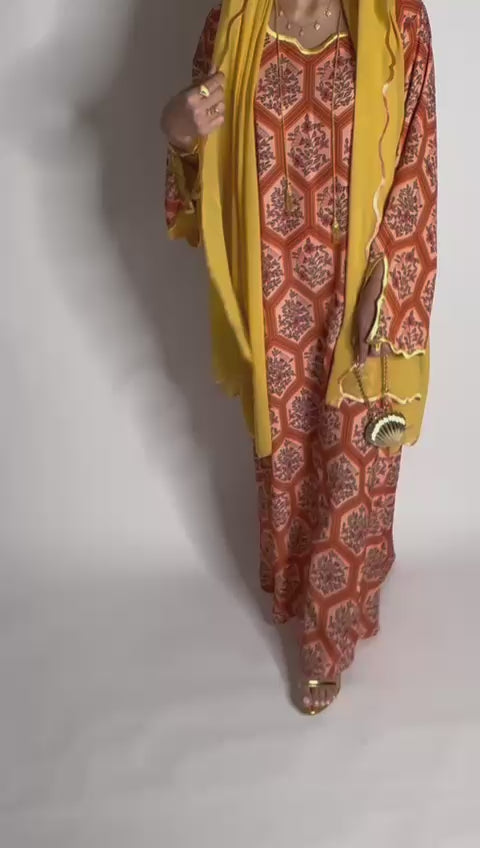 A525 - Orange & Mustard Hexagon Jalabiya & Matching Head Scarf