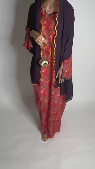 Red & Dark Purple Hexagon Flower Pattern Jalabiya with Embroidered Sleeves and Dark Purple Head Scarf with Embroidery on 3 Corners of the Head Scarf